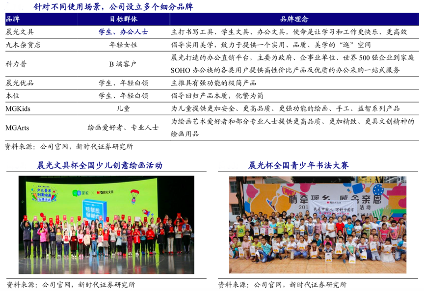 經(jīng)典案例:根據(jù)公司官網(wǎng)、新時(shí)代證券研究所等綜合資訊表明,晨光公司針對(duì)不同使用場景設(shè)立多個(gè)細(xì)分品牌,包括晨光文具、九木雜貨店、科力普、晨光優(yōu)品、本位、MGKids 和 MGArts 七大品牌。并自2013年起已舉辦六屆“晨光文具杯”少兒美術(shù)創(chuàng)意繪畫征集活動(dòng),獲得教育界、社會(huì)媒體及眾多藝術(shù)愛好者的廣泛關(guān)注。