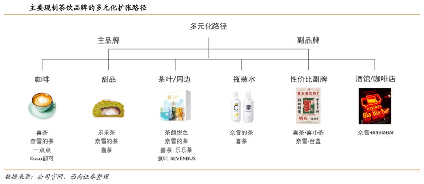 經(jīng)典案例:根據(jù)公司官網(wǎng)、西南證券等綜合資訊表明,深耕一線城市的高端網(wǎng)紅品牌對(duì)客流、客單量的要求更高,奈雪、喜茶的推新速度在 1-1.2 款/周,除了茶飲相關(guān)產(chǎn)品,兩者還在瓶裝水、餐飲副 牌的領(lǐng)域試水經(jīng)營(yíng)。而小店經(jīng)營(yíng)的模式并不適合提供多樣化的 SKU,茶顏悅色、蜜雪冰城一年上新款式不到 5 個(gè)。