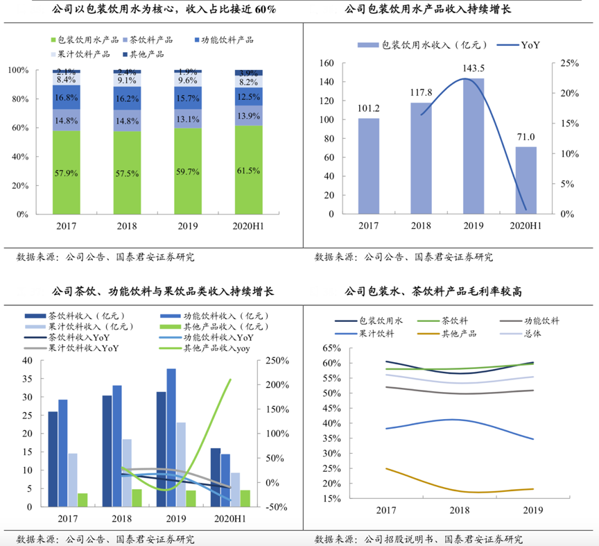 經(jīng)典案例:根據(jù)公司公告、國(guó)泰君安證券研究等綜合資訊表明,農(nóng)夫山泉公司目前主要產(chǎn)品覆蓋了包裝飲用水、茶飲料、功能飲料及果汁飲料四大品類。從 2017-2019 年占比數(shù)據(jù)來看,作為農(nóng)夫山泉公司核心產(chǎn)品的包裝飲用水在年收入中占比提升,已接近60%。目前茶飲料、功能飲料及果汁飲料三大品類飲料產(chǎn)品的收入之和大致占公司總收入的 40%,形成了包裝水之外業(yè)績(jī)?cè)鲩L(zhǎng)的重要引擎。