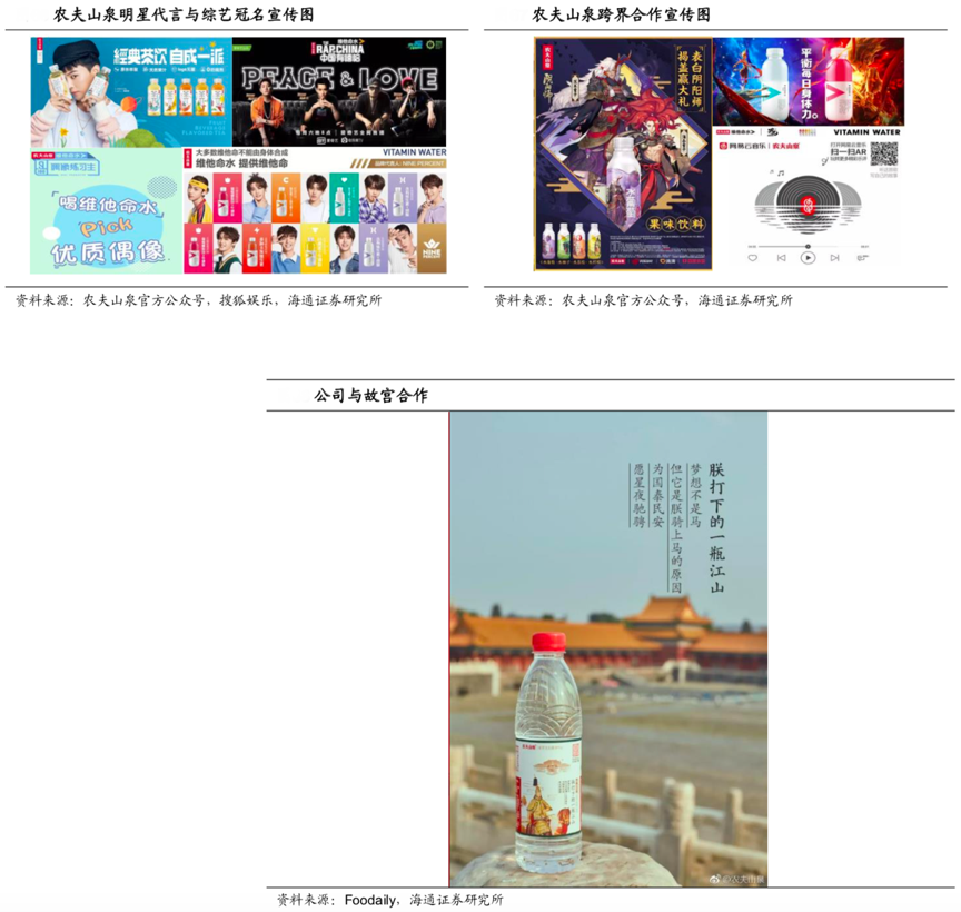 經(jīng)典案例:根據(jù)搜狐娛樂、農(nóng)夫山泉官方公眾號(hào)、Foodaily、海通證券研究所等綜合資訊表明,農(nóng)夫山泉公司通過更換產(chǎn)品包裝形象,以及同中國(guó)有嘻哈、偶像練習(xí)生等節(jié)目的合作,力量帝維他命水煥發(fā)了新的活力,2017 年至 2019 年復(fù)合增長(zhǎng)率超過 47%。2017 年,其與網(wǎng)易云音樂聯(lián)合推出限量款“樂瓶”,將網(wǎng)易云樂評(píng)中精選 30 種 不同的樂評(píng)印制在 4 億瓶農(nóng)夫山泉飲用天然水瓶身,加上 AR 黑科技的加持。2018 年,其推出“故宮瓶”,通過機(jī)智的文案和唯美的視覺把故宮文化和農(nóng)夫山泉融合在一起,給消費(fèi)者帶來新的體驗(yàn)。
