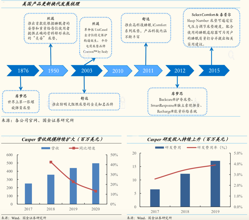 經(jīng)典案例:根據(jù)各公司官網(wǎng)、wind、國金證券研究所等綜合資訊表明,近年來,國外品牌 Casper 快速發(fā)展,近年來其逐步提高研發(fā)費(fèi)用,研發(fā)創(chuàng)新一方面使得 Casper 床墊將頂層的優(yōu)質(zhì)乳膠泡沫和中間層的優(yōu)質(zhì)記憶泡沫融合 在一起,確保身體在睡眠過程中不同角度的支撐和舒適度,產(chǎn)品體驗感領(lǐng)先同行,另一方面設(shè)計使得 Casper 床墊可用迷你冰箱尺寸的箱子包裝運(yùn)輸,顯著降低運(yùn)輸成本。