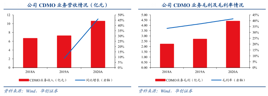 經(jīng)典案例:根據(jù)wind、華創(chuàng)證券等綜合資訊表明,普洛藥業(yè)公司對 CDMO 業(yè)務的強化在 2020 年前后正式進 入收獲期。從 2020 年年報來看,公司 CDMO 業(yè)務實現(xiàn)收入 10.55 億元,同比增長 46.14%,毛利 4.39 億元,同比增長 63.20%,毛利率 41.62%,同比上升 4.33pct,已呈現(xiàn)出明確的爆發(fā)趨勢。