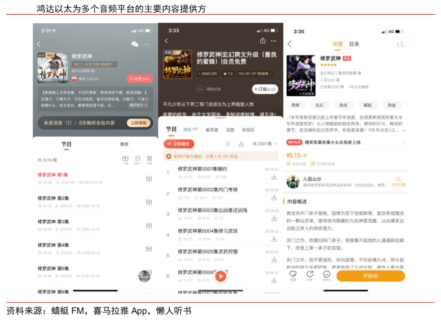經(jīng)典案例:根據(jù)蜻蜓FM、喜馬拉雅App、懶人聽(tīng)書(shū)、中信證券研究部等綜合資訊表明,鴻達(dá)以太憑借海量的獨(dú)家有聲內(nèi)容形成護(hù)城河,成為喜馬拉雅、蜻蜓 FM、懶人聽(tīng)書(shū)、酷我暢聽(tīng)等音頻平臺(tái)的主要內(nèi)容提供方之一。鴻達(dá)以太旗下作品《修羅武神》、《權(quán)利巔峰》在蜻蜓 FM、喜 馬拉雅、懶人聽(tīng)書(shū)、酷我暢聽(tīng)的總播放量均超過(guò)25 億次。