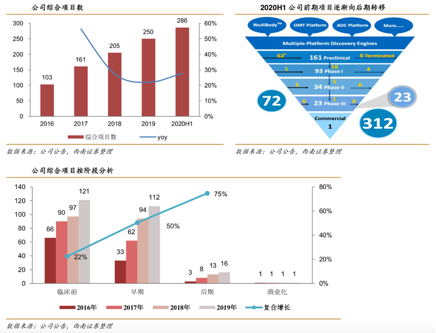經典案例:根據(jù)公司公告、西南證券等綜合資訊表明,藥明生物始終堅持“Follow-the-Molecule”的戰(zhàn)略模式,即“跟著藥物分子發(fā)展階段擴大業(yè)務”。生物藥研發(fā)項目粘性較強,鎖定早期項目更容易使合作關系延續(xù)至商業(yè)化生產階 段??蛻羧糇兏丈虝ㄙM較高的轉讓成本,因此更多客戶傾向選擇全套的研究和生產外包服務。在公司戰(zhàn)略模式指導下,藥明生物的客戶基礎不斷加大,綜合項目數(shù)由 2019 年同期的 224 個,增長 27.7%至 2020 年上 半的 286 個。