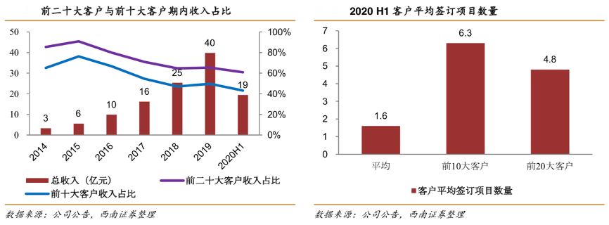 經典案例:根據(jù)公司公告、西南證券等綜合資訊表明,近年來,藥明生物公司臨床后期研發(fā)的能力不斷加強,越來越多的公司選擇一貫制服務,即從藥物發(fā)現(xiàn)到臨床試驗都由藥明生物來完成,從其大客戶的情況來看,2020 年上半年公司前十大客戶的收入占比為 43.1%,其十大客戶的平均簽訂的項目數(shù)量為6個,新項目續(xù)簽率超過80%。