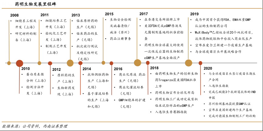 經(jīng)典案例:根據(jù)公司資料、西南證券等綜合資訊表明,藥明生物公司建立于 2008 年,最初為客戶提供細(xì)胞系培育和蛋白質(zhì)分析服務(wù)。后來業(yè)務(wù)擴(kuò)大到生物新藥發(fā)現(xiàn)、生物新藥開發(fā)、生物檢測以及 GMP 生產(chǎn),成長為一家真正意義上提供從概念到商業(yè)化一站式服務(wù)、開放式生物制藥技術(shù)平臺公司。