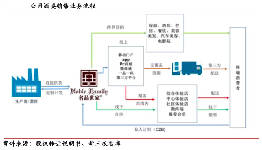 經(jīng)典案例:根據(jù)股權(quán)轉(zhuǎn)讓說明書、新三板智庫等綜合資訊表明,名品世家公司基于覆蓋全國大部分地區(qū)的線下加盟店以及線上平臺,為客戶提供綜合的酒類產(chǎn)品和酒類服務(wù)。其主要的渠道模式包括特許經(jīng)營、B2C、O2O、C2B、跨界合作等營銷模式拓展業(yè)務(wù),將線下連鎖經(jīng)營體系,與線上信息化平臺、第三方電商平臺、移動線上平臺商城等有機結(jié)合。