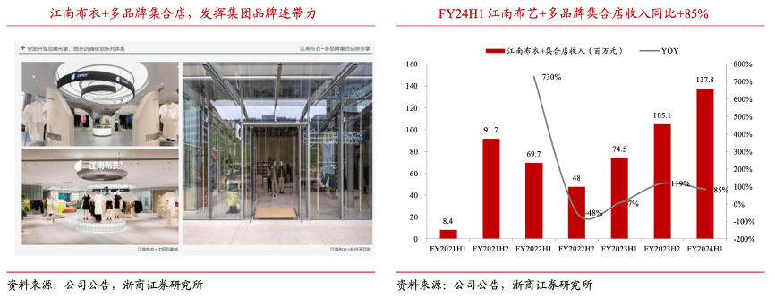 經(jīng)典案例:根據(jù)公司公告、浙商證券研究所等綜合資訊表明,江南布衣通過“不止盒子私人搭配”、 “跨品牌會員權(quán)益”、“免運(yùn)費(fèi)寄送”、“服裝高端洗護(hù)”等會員專屬體驗的消費(fèi)場景,加強(qiáng)粉 絲粘性。FY2023H2、FY2024H1 江南布衣+集合店收入同比分別+119%、+85%至 1.05、 1.38 億元,彰顯集團(tuán)品牌連帶力與新渠道的快速增長。
