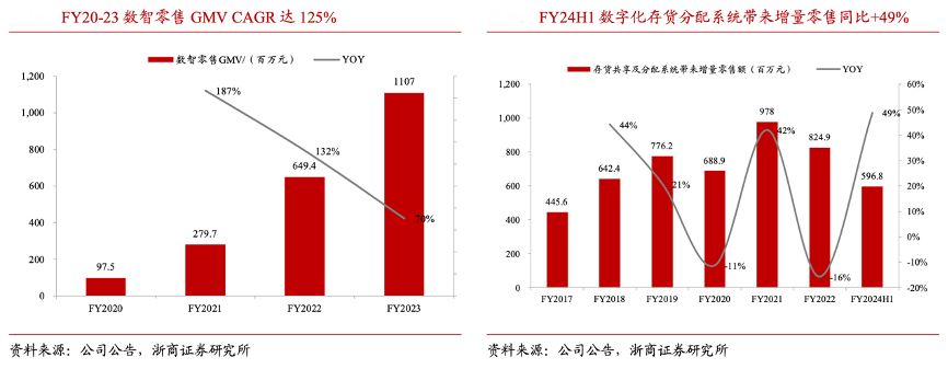 經(jīng)典案例:根據(jù)公司公告、浙商證券研究所等綜合資訊表明,江南布衣公司充分運(yùn)用互聯(lián)網(wǎng)+, 強(qiáng)化 國內(nèi)外各類零售網(wǎng)絡(luò)精細(xì)化運(yùn)營,加強(qiáng)私域運(yùn)營深度與消費(fèi)者黏性,同時通過精細(xì)化庫存 管理賦能銷售。FY2020-2023 年數(shù)智零售 GMV 年化復(fù)合增長 125%至 11.1 億元。