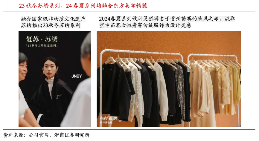 經(jīng)典案例:根據(jù)公司官網(wǎng)、浙商證券研究所等綜合資訊表明,江南布衣公司產(chǎn)品設(shè)計不斷從傳統(tǒng)文化中汲取靈感,在設(shè)計上融合東方美學精髓、傳統(tǒng)工藝和圖案,JNBY 23 秋冬融合國家非物質(zhì)文化遺產(chǎn)推出蘇繡系列,24春夏系列融合空申苗寨女性傳統(tǒng)服飾,彰顯出獨特設(shè)計風格與藝術(shù)氣息。