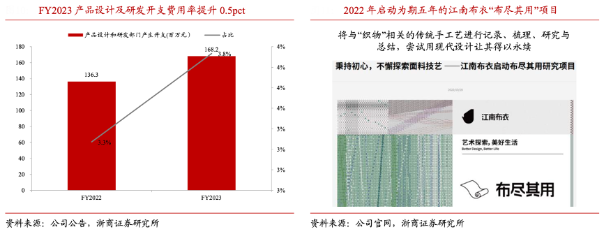 經(jīng)典案例:根據(jù)公司公告、公司官網(wǎng)、浙商證券研究所等綜合資訊表明,江南布衣差異化面料研發(fā)打造品牌藝術(shù)辨識度和產(chǎn)品舒適度,2022 年 啟動為期五年的江南布衣“布盡其用”項目,F(xiàn)Y2023 公司產(chǎn)品設(shè)計及研發(fā)部門開支同比 +23.4%至 1.7 億元,產(chǎn)品設(shè)計及研發(fā)開支費用率同比提升 0.5pct 至 3.8%,進一步夯實從布料到生產(chǎn)的強大研發(fā)基底,通過極具辨識度和舒適度的面料彰顯設(shè)計師品牌特性,增強客群黏性。
