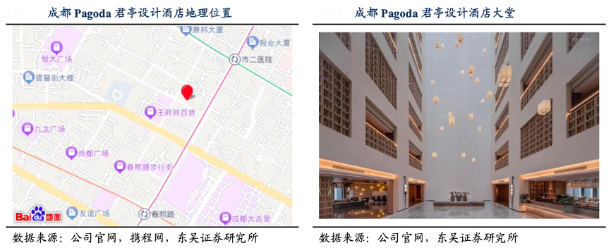 經(jīng)典案例:根據(jù)公司官網(wǎng)、攜程網(wǎng)、東吳證券研究所等綜合資訊表明,成都 Pagoda 于 2022 年 3 月 開(kāi)業(yè),屬“Pagoda 君亭”品牌西南布局首店,酒店位于西部文化產(chǎn)業(yè)中心高層,處于春熙路商圈。成都 Pagoda 大堂結(jié)合現(xiàn)代 AR 交互技術(shù),展 示林俊廷先生作品《鎏瑩》,中庭采用獨(dú)特孔明燈設(shè)計(jì),營(yíng)造中式設(shè)計(jì)氛圍。