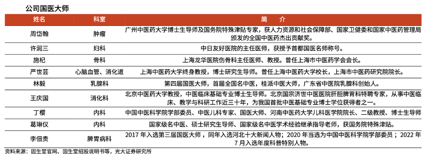 經(jīng)典案例:根據(jù)固生堂官網(wǎng)、固生堂招股說明書、、光大證券研究所等綜合資訊表明,固生堂在傳承和發(fā)展中醫(yī)藥事業(yè)方面做出了卓越貢獻,并邀請了多位國醫(yī)大師加入其團隊,包括周岱翰、施杞等多為中醫(yī)藥行業(yè)泰斗。此外,固生堂還成立了多個由國醫(yī)大師、全國名中醫(yī)牽頭的名醫(yī)傳承工作室,這些工作室的成立進一步推動了中醫(yī)藥的傳承與發(fā)展。
