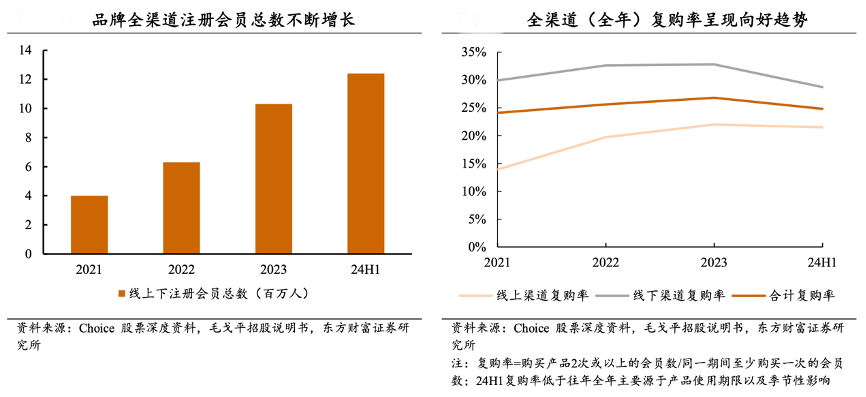 經典案例:根據choice股票深度資料、毛戈平招股說明書、東方財富證券研究所等綜合資訊表明,毛戈平公司全渠道注冊會員數量快速 積累,從 2021 年的 400 萬提升至 24H1 的 1240 萬(24H1 線下渠道擁有 420 萬 會員)。除會員數目擴張外,會員消費粘性亦在穩(wěn)步提升,從 2021-2023 年線上、 線下渠道復購率均穩(wěn)步向好,尤其線上渠道復購率從 13.9%快速提升至 22.0%, 遠高于行業(yè)平均線上 10%的復購率。