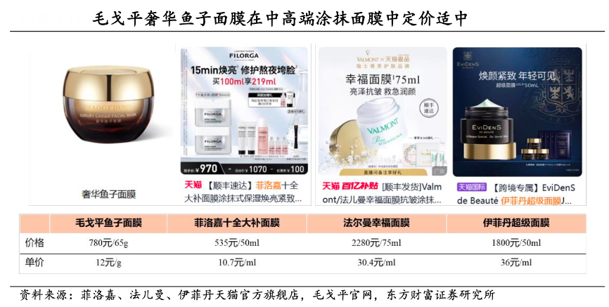 經典案例:根據菲洛嘉、法兒曼、伊菲丹天貓官方旗艦店、毛戈平官網、東方財富證券研究所等綜合資訊表明,毛戈平品牌拓展護膚品線是沿著“提供更好的妝容表現”邏輯進行延伸,毛戈平奢華 魚子面膜產品在契合品牌定位的同時,通過提供較好的保濕抗衰效果改善皮膚狀態(tài),以實現服帖妝效。