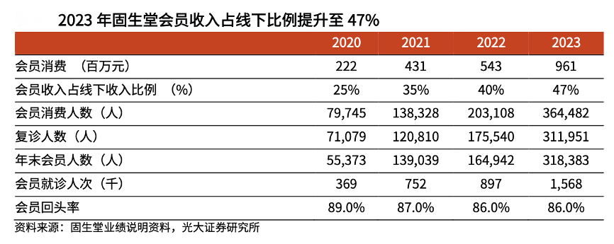 經(jīng)典案例:根據(jù)固生堂業(yè)績(jī)說明材料、光大證券研究所等綜合資訊表明,固生堂公司自 2019 年 3 月起建立會(huì)員體系,會(huì)員卡有效期為一年,主要服務(wù)包括全周期醫(yī)療健康解決方案、掛號(hào)優(yōu)惠、代煎服務(wù)等。2020-2023年會(huì)員消費(fèi)人數(shù)實(shí)現(xiàn)快速增長(zhǎng),從 2020 年的 7.97 萬人增長(zhǎng)至 2023 年的 36.45 萬人。此外,會(huì)員消費(fèi)占線下收入比重逐年提升,從 2020 年的 25%增長(zhǎng)至 2023 年的 47%。