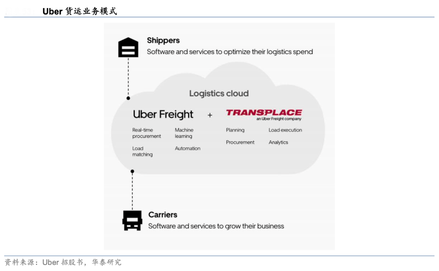 經(jīng)典案例:根據(jù)Uber招股書、華泰研究等綜合資訊表明,Uber Freight 以數(shù)字化技術(shù)簡化物流,連接托運人與承運人。在 Uber Freight 平臺,托運 人在這里張貼貨物,承運人投標或接受預先協(xié)商好的運費,減少交易摩擦,實現(xiàn)了實時價格發(fā)現(xiàn)。截至 4Q23,該平臺擁有超過 75000 個活躍運營商和 6500 個托運人賬戶,網(wǎng)絡(luò)效應(yīng)不斷增長。
