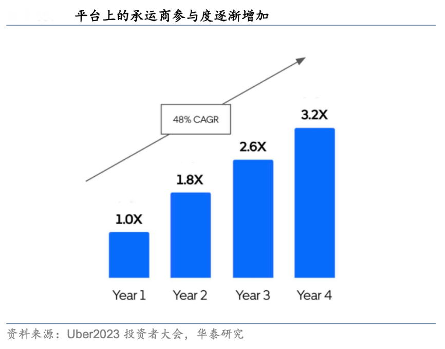 經(jīng)典案例:根據(jù)Uber投資者大會、華泰研究等綜合資訊表明,Uber Freight 注重維系承運商忠誠度,通過提供透明的計費系統(tǒng)、及時的結(jié)算服務(wù)以及各類獎勵計劃等措施提升參與度,承運商參與度逐年增加,CAGR 達到 48%。盡管面臨 C.H. Robinson、 DAT Solutions 等競爭對手,Uber Freight 仍憑借其技術(shù)優(yōu)勢和平臺特性,成為眾多承運商 的首選合作伙伴。