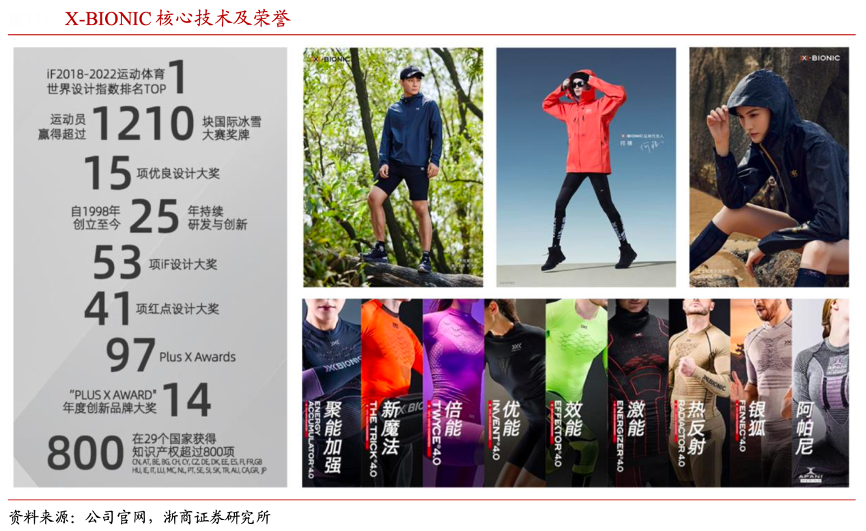 經(jīng)典案例:根據(jù)公司官網(wǎng)、浙商證券研究所等綜合資訊表明,X-BIONIC 作為瑞士知名的黑科技運(yùn)動(dòng)品牌,擁有超過 800 項(xiàng)技術(shù)專利,有深厚的技術(shù)底蘊(yùn),尤其在恒溫系統(tǒng)等核心仿生科技領(lǐng)域名列前茅,通過“將汗水轉(zhuǎn)化成能量(TURN SWEAT INTO ENERGY)”從而大幅提升運(yùn)動(dòng)表現(xiàn)。