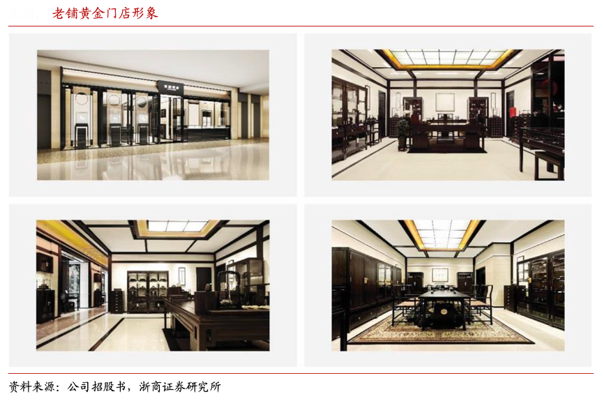 經(jīng)典案例:根據(jù)公司招股書、浙商證券研究所等綜合資訊表明,老鋪黃金所有門店均為自營,其中直營 門店 22 家,聯(lián)營門店 11 家,能夠嚴格控制服務(wù)質(zhì)量,建立和維護良好的品牌形象。在門 店體驗方面,老鋪黃金通過書房主體場景提供沉浸式的消費體驗,所有門店統(tǒng)一裝修風(fēng)格,呈現(xiàn)出中國傳統(tǒng)文化的意境。
