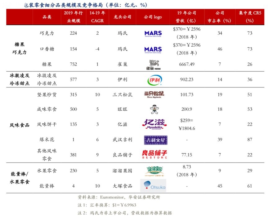 經(jīng)典案例:根據(jù)Euromonitor、華安證券研究所等綜合資訊表明,包裝零食細(xì)分品類規(guī)模比較大,且每一個(gè)小品類里都已涌現(xiàn)出了一些細(xì)分龍頭,如巧克力龍頭瑪氏,堅(jiān)果炒貨龍頭三只松鼠,但還未出現(xiàn)統(tǒng)領(lǐng)全行業(yè)的龍頭公司。2019 年我國(guó)休 閑食品行業(yè) CR5 僅為 16.3%,而全球休閑食品行業(yè) CR5 為 25.6%,我國(guó)休閑食品品類極具成長(zhǎng)空間。
