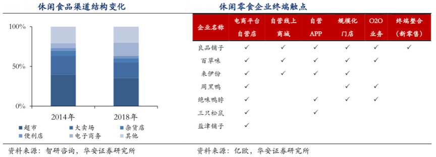 經(jīng)典案例:根據(jù)智研咨詢、華安證券研究所等綜合資訊表明,2014年-2018年休閑食品渠道結(jié)構(gòu)中超市占比從39%降為 35%,電子商務(wù)占比從 6%增長(zhǎng)至 17%,消費(fèi)者忠誠(chéng)度較低、渠道選擇分散。同時(shí)根據(jù)億歐、華安證券研究所等綜合資訊表是,休閑零食企業(yè)的終端觸點(diǎn)更加多元化,良品鋪?zhàn)釉陔娚唐脚_(tái)、自營(yíng) 線上商城、規(guī)?;T店等各方面都有布局,三只松鼠主要集中于電商平臺(tái)自營(yíng)店和自營(yíng) APP。