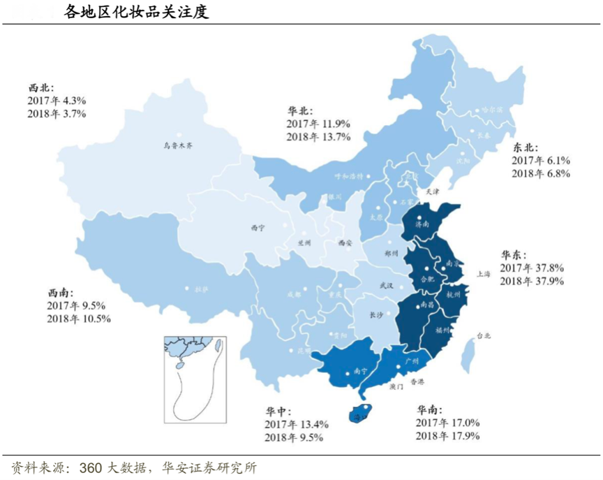 典型示例:根據(jù)360大數(shù)據(jù)、華安證券研究所等綜合資訊表明,我國(guó)一、二、三、四線城市用戶對(duì)化妝品關(guān)注度增長(zhǎng)率分別為 6.2%、6.6%、12.4%和 10.6%。凱度數(shù)據(jù)亦顯示,2017 年我國(guó)高線/低線城市美妝個(gè)護(hù)消費(fèi)金額增長(zhǎng)率分別為 6.6%、8.4%。