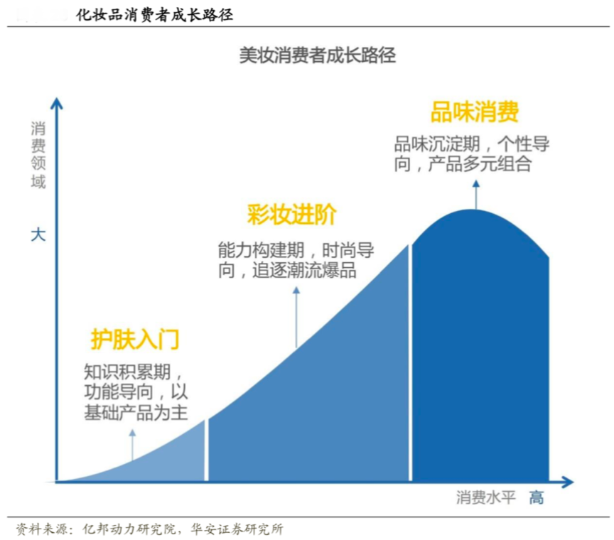 經(jīng)典示例:根據(jù)億邦動(dòng)力研究院、華安證券研究所等綜合資訊表明,美妝消費(fèi)者有其獨(dú)特成長(zhǎng)路徑,美妝品類正持續(xù)升級(jí)中,從“護(hù)膚入門”向彩妝進(jìn)階、品味消費(fèi)進(jìn)化,同時(shí)“品類消費(fèi)”大大增長(zhǎng),僅護(hù)膚階段便可以從最簡(jiǎn)單的潔面、 面霜拓展到數(shù)個(gè)品類,凱度數(shù)據(jù)顯示消費(fèi)者每年購(gòu)買的不同類型化妝品數(shù)量逐年增加,2016年消費(fèi)者平均每年購(gòu)買3.7個(gè)護(hù)膚品。