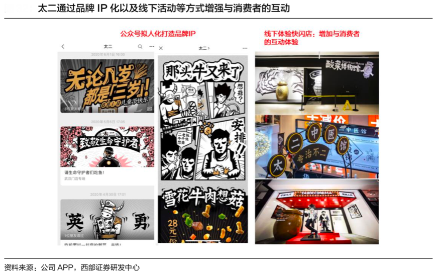 經(jīng)典案例:根據(jù)公司APP、西部證券研發(fā)中心等綜合資訊表明,九毛九品牌新媒體營(yíng)銷策劃方面頗有成就,目前九毛九及太二微信官方賬號(hào)訂閱者均超過(guò)了三四百萬(wàn),太二還擁有 200 多個(gè)微信粉絲群,核心粉絲數(shù)超過(guò) 10 萬(wàn)人,產(chǎn)品年輕化溝通特征顯著。