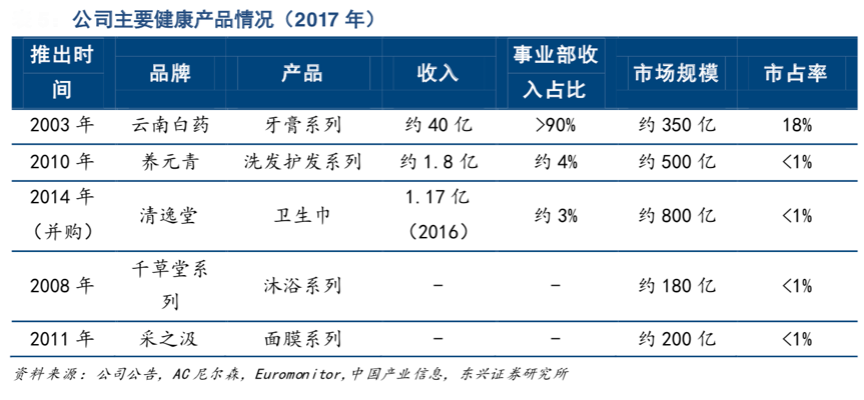 經(jīng)典案例:根據(jù)公司公告、AC尼爾森、Euromonitor、中國(guó)產(chǎn)業(yè)信息、東興證券研究所等綜合資訊表明,云南白藥依托其在止血抗炎藥品領(lǐng)域的強(qiáng)大優(yōu)勢(shì), 于 2003 年推出云南白藥牙膏,主打緩解牙齦出血等功效,迅速填補(bǔ)了國(guó)內(nèi)高端中草藥牙膏的空白市場(chǎng),經(jīng)過 15 年發(fā)展,2017 年收入已超過 40 億元,成為國(guó)產(chǎn)牙膏第一品牌,整體市占率約 18%。