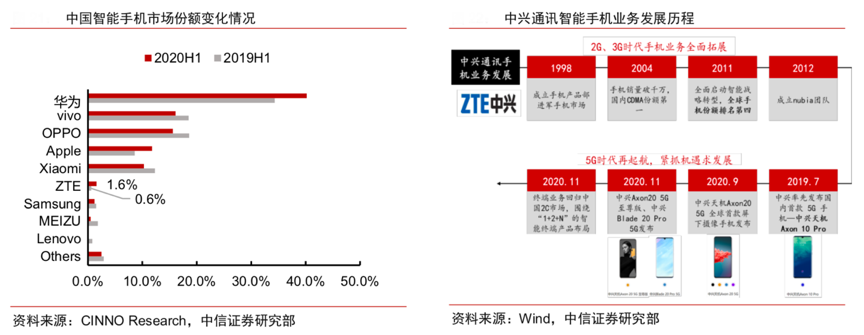 經(jīng)典案例:根據(jù)CINNO Research、wind、中信證券研究部等綜合資訊表明,2020H1,中興通訊在中國智能手機市場的市占率提升至 1.6%(2019H1 為 0.6%),11 月,中興通訊在終端渠 道合作伙伴大會上表示:2021 年,中興通訊終端業(yè)務(wù)將全面回歸中國 2C 市場,打造“1+2+N” 的智能終端產(chǎn)品布局:以手機核心產(chǎn)品為入口,圍繞個人數(shù)據(jù)和家庭數(shù)據(jù) 2 大方向,配合智能穿戴等生活周邊產(chǎn)品,致力于打造科技、品質(zhì)、年輕的終端品牌形象。