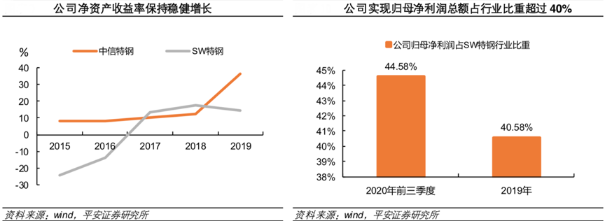 經(jīng)典案例:根據(jù)wind、平安證券研究所等綜合資訊表明,中信特鋼盈利能力強(qiáng)大,2015年以來盈利能力一直保持穩(wěn)健增長。2019 年公司資產(chǎn)重組實(shí)現(xiàn)整體上市后,公司盈利絕對額占 SW 特鋼 14 家上市公司盈利總額比重超過40%,盈利規(guī)模位居行業(yè)之首。