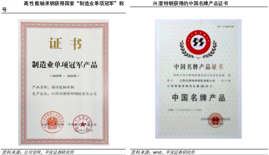 經(jīng)典案例:根據(jù)公司官網(wǎng)、wind、平安證券研究所等綜合資訊表明,中信特鋼是中國鋼鐵工業(yè)協(xié)會副會長單位和中國特鋼企業(yè)協(xié)會會長單位,在中國特鋼行業(yè)居主導(dǎo)地位,發(fā)揮著“風(fēng)向標(biāo)”作用;2019年,子公司興澄特鋼高性能軸承鋼獲得工信部發(fā)布 “制造業(yè)單項(xiàng)冠軍”稱號;青島特鋼 1960MPa 級 橋 梁纜索盤條榮獲中國鋼協(xié)頒發(fā)的“中國鋼鐵工業(yè)產(chǎn)品開發(fā)市場開拓獎”。