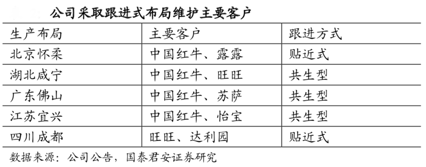 經(jīng)典案例:根據(jù)國(guó)家統(tǒng)計(jì)局、公司官網(wǎng)、國(guó)泰君安證券研究等綜合資訊表明,奧瑞金公司為中國(guó)紅牛、東鵬特飲、戰(zhàn)馬 和國(guó)內(nèi)外若干知名品牌產(chǎn)品提供穩(wěn)定高質(zhì)的包裝一體化服務(wù)。在二片罐 業(yè)務(wù)方面,其與青島、百威、雪花、燕京等客戶建立重要業(yè)務(wù)合作關(guān)系,在奶粉領(lǐng)域,其充分發(fā)揮廠中廠模式的優(yōu)勢(shì),成為飛鶴、君樂寶、伊利等奶粉企業(yè)的主要包裝供應(yīng)商。