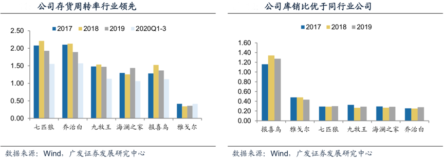 經(jīng)典案例:根據(jù)wind、廣發(fā)證券發(fā)展研究中心等綜合資訊表明,相較于以零售為導(dǎo)向的企業(yè),喬治白采取B/C2B模式,即由訂單驅(qū)動的大規(guī)模個性化定制模式。其存貨周轉(zhuǎn)率及庫銷比水平均處于行業(yè)領(lǐng)先地位同時由于職業(yè)裝客戶具備一定的延續(xù)性和穩(wěn)定性,在疫情背景下公司的庫存壓力仍較小,公司2020Q1-3存貨周轉(zhuǎn)率為1.57,仍高于同行業(yè)其他公司。