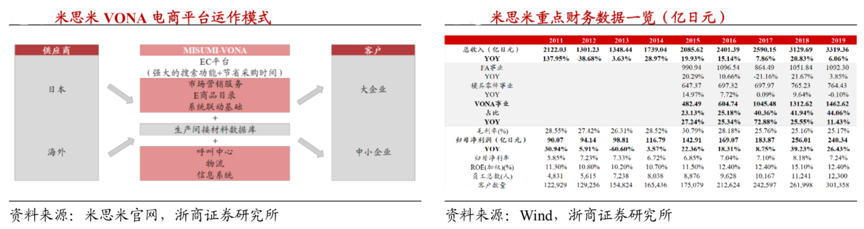 經(jīng)典案例:根據(jù)米思米官網(wǎng)、wind、浙商證券研究所等綜合資訊表明,米思米成立于 1963 年,是日本 MRO 工業(yè)品最大電商平臺。其旗下業(yè)務(wù)線有 “FA 事業(yè)”、“模具零件 事業(yè)”、“VONA 事業(yè)”三大事業(yè)部,其中 VONA 是米思米在 2010 年底推出、以電商銷售為主的業(yè)務(wù)線。13 年以后,在 VONA 事業(yè)部的拉動下(15→19 年收入從 482 億日元到 1463 億日元),公司收入和利潤均進(jìn)入快速增長階段。
