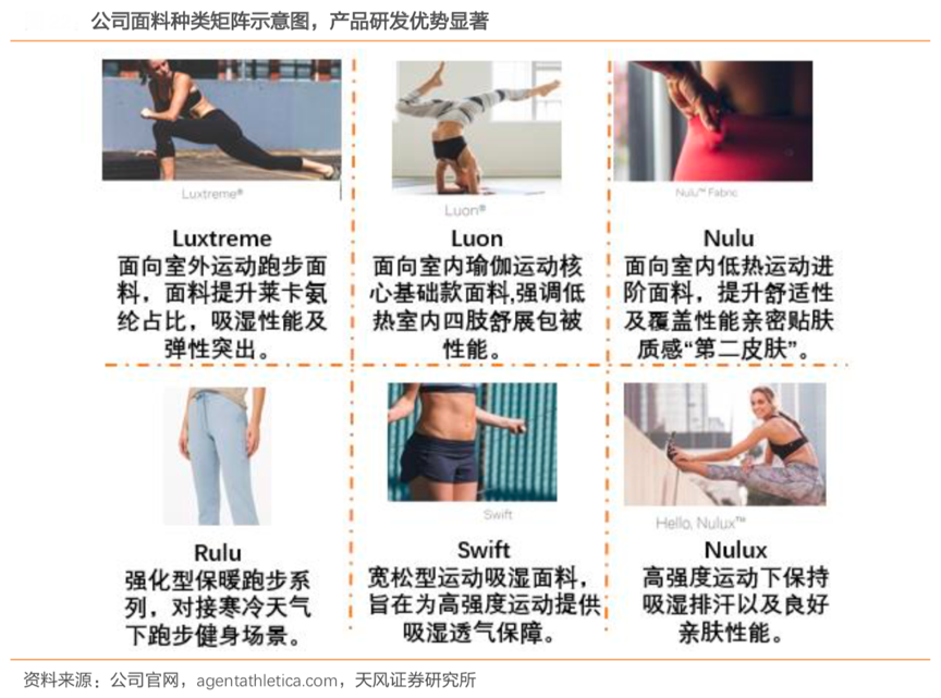 經(jīng)典案例:根據(jù)公司官網(wǎng)、agentathletica.com、天風(fēng)證券研究所等綜合資訊表明,Lululemon 于 1998 年創(chuàng)立初始即針對(duì)瑜伽新興運(yùn)動(dòng)重新規(guī)劃設(shè)計(jì)面料,利用尼龍材料本身的拉伸韌性優(yōu)勢(shì)為面料基礎(chǔ),配合萊卡氨綸材料彈性柔軟特性,分別以 86%-14%配比推出現(xiàn)代瑜伽服專(zhuān)用面料 Luon。Luon 面料強(qiáng)度韌性及對(duì)身體皮膚覆蓋性能更優(yōu)秀,同時(shí)具備純?nèi)R卡氨綸面料所不具備的透氣吸濕功能。