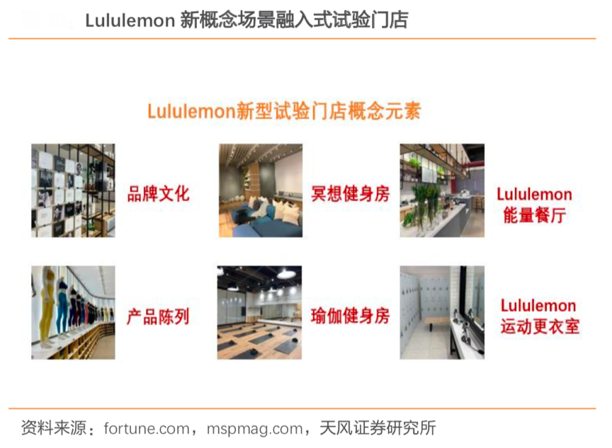 經(jīng)典案例:根據(jù)fortune.com、mspmag.com、天風(fēng)證券研究所等綜合資訊表明, Lululemon提出“新概念場景融入式門店”,旨在為客群提供一體化場景式購物體驗,探索關(guān)聯(lián)行業(yè)協(xié)同運營可行性:試驗門店中開辟“店中店”形式健身房,提供瑜伽、冥想低熱及綜訓(xùn)等高熱活動課程服務(wù),并提供咖啡餐飲服務(wù),同時配合推廣 mirror 智能健身產(chǎn)品服務(wù)。