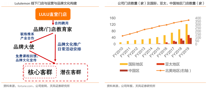 經(jīng)典案例:根據(jù)fortune.com、公司官網(wǎng)、公司年報、天風(fēng)證券研究所等綜合資訊表明,Lululemon 以線下直營門店作為品牌社群區(qū)域中心,通過 Lululemon 獨有的“品牌教育家”與 super girls 等目標(biāo)客群建立緊密聯(lián)系,同時通過 Lululemon 品牌大使宣傳、免費瑜伽/ 健身課程回饋、品牌社區(qū)活動(events)鞏固并吸納更多潛在客群,實現(xiàn)以線下門店為中心對地區(qū)周邊健身客群的有效覆蓋。Lululemon 線下直營門店整體規(guī)模 FY2019 末已經(jīng)達(dá)到 491 家。