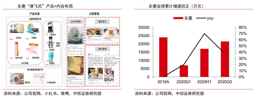 經(jīng)典案例:根據(jù)公司官網(wǎng)、小紅書、微博、中信證券研究部等綜合資訊表明,2018 年,東菱在鞏固原有優(yōu)勢品類的基礎(chǔ)上,陸續(xù)推出多功能早餐機(jī)、加熱便當(dāng)盒等網(wǎng)紅產(chǎn)品,將使用場景從廚房延伸到客廳、辦公室等生活場合;營銷上,積極引入“爆款產(chǎn)品+內(nèi)容營銷”的打法;品牌定位上,主推西式浪漫的情趣生活,并對(duì)品牌進(jìn)行富有法國風(fēng)情的詮釋。