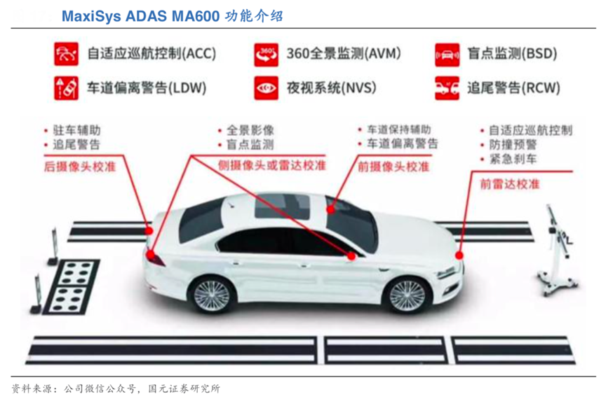 經典案例:根據公司微信公眾號、國元證券研究所等綜合資訊表明,2020 年 11 月,道通科技新一代可折疊ADAS 校準系統(tǒng) MA600 正式發(fā)布。MaxiSys ADAS MA600 支持 ACC 自適應巡航控制系統(tǒng)標定、LDW 車道偏離警告系統(tǒng)標定、NVS 夜視系統(tǒng)標定等六大核心功能,車型覆蓋率高達 95%。該產品不僅為客戶提供了更完整的診斷功能軟件和全面精確的校準工具,而且解決了傳統(tǒng)產品笨重不便運輸的行業(yè)痛點,首次實現了單人可折疊攜帶設計,樹立標定設備新標準。
