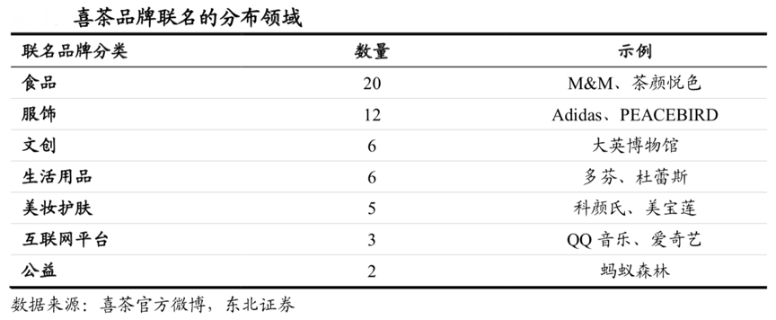 經(jīng)典案例:根據(jù)喜茶官方微博、東北證券等綜合資訊表明,自從 2017 年第一次嘗試和化妝品品牌美寶蓮開展聯(lián)名合作之后,喜茶的聯(lián)名次數(shù)逐年增多,截止到 2020 年 6 月,喜茶已經(jīng)和來自食品、服飾、文創(chuàng)等不同行業(yè)的54 個品牌開展了品牌聯(lián)名。通過一系列高強(qiáng)度的品牌聯(lián)名,喜茶享受著來自社交媒體平臺的討論熱度,從而維持自身“網(wǎng)紅品牌”的活力。