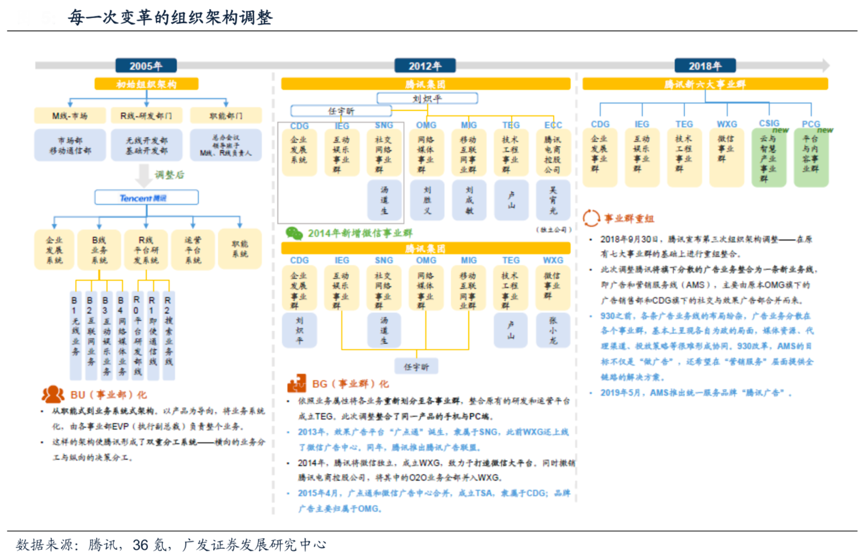 經(jīng)典案例:根據(jù)騰訊、36氪、廣發(fā)證券發(fā)展研究中心等綜合資訊表明,2018年的“930改革”,是騰訊從消費(fèi)互聯(lián)網(wǎng)向產(chǎn)業(yè)互聯(lián)網(wǎng)升級的一次變革,不僅事業(yè)群進(jìn)行了較大調(diào)整,還專門整合了AMS事業(yè)線。AMS事業(yè)線由原本網(wǎng)絡(luò)媒體事 業(yè)群(OMG)旗下的廣告銷售部和企業(yè)與發(fā)展事業(yè)群(CDG)旗下的社交與效果廣 告部合并而來,自此騰訊廣告業(yè)務(wù)在媒體資源、投放數(shù)據(jù)、銷售及渠道系統(tǒng)上逐漸開始實(shí)現(xiàn)整合以及協(xié)同。