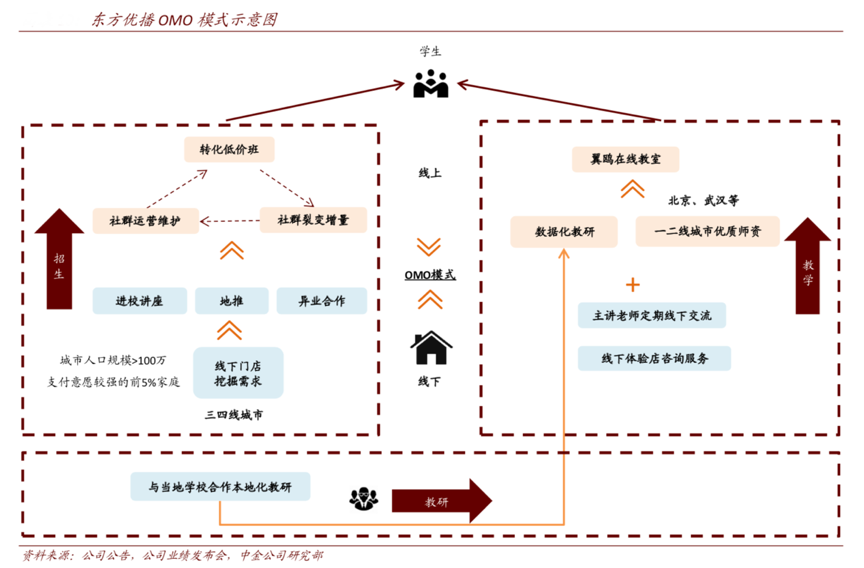 經(jīng)典案例:根據(jù)公司公告、公司業(yè)績(jī)發(fā)布會(huì)、中金公司研究部等綜合資訊表明,東方優(yōu)播通過(guò)地推、進(jìn)校講座、異業(yè)合作等線下方式接觸當(dāng)?shù)厣?,進(jìn)行低成本引流,繼而通過(guò)在線低價(jià)課將線下流量導(dǎo)入線上。在線上社群深度運(yùn)營(yíng)中進(jìn)行用戶篩選和維護(hù),提高正課轉(zhuǎn)化率,同時(shí)社群裂變也可以進(jìn)一步擴(kuò)大增量,形成線上招生渠道的自循環(huán)。