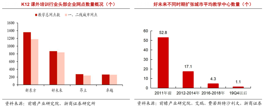 經(jīng)典案例:根據(jù)前瞻產(chǎn)業(yè)研究院、艾瑞、弗若斯特沙利文、浙商證券研究所等綜合資訊表明, K12 行業(yè)龍頭新東方、好未來、昂立、卓越網(wǎng)點大量分布于一、二線城市,一二線城市網(wǎng)點占比高達 85%以上,而三、四線城市受制于家庭教育觀念、經(jīng)濟水平和教育資源,存在著網(wǎng)點數(shù)量少、下沉難度大等困難。以好未來為例,其始終致力于線下網(wǎng)點的擴張。隨著一、二線城市布局完成,其網(wǎng)點向下沉市場延伸,但下沉城市網(wǎng)點密度依然很小。