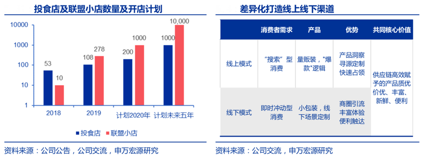 經(jīng)典案例:根據(jù)公司公告、公司交流、申萬宏源研究等綜合資訊表明,截至 2019 年,三只松鼠公司累計(jì)開設(shè)投食店 108 家,實(shí)現(xiàn)營(yíng)收 5.18 億元,同比增長(zhǎng) 48%。加盟方面,其以助力年輕創(chuàng)業(yè)者為出發(fā)點(diǎn),選址以社區(qū)店鋪為主 進(jìn)行門店拓展。截至 2019 年,其累計(jì)開設(shè)聯(lián)盟小店 278 家,實(shí)現(xiàn)營(yíng)收 2.8 億元。
