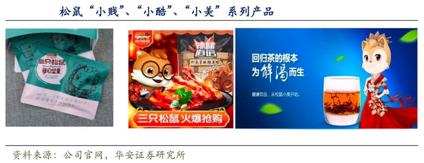 經(jīng)典案例:根據(jù)公司官網(wǎng)、華安證券研究所等綜合資訊表明,三只松鼠以堅(jiān)果起家,松鼠形象和堅(jiān)果品類(lèi)高度契合,代表著不同系列產(chǎn)品,“小酷”——干果類(lèi)產(chǎn)品,“小賤”——休閑 零食類(lèi)產(chǎn)品,“小美”——花果類(lèi)產(chǎn)品。其以動(dòng)畫(huà)為支點(diǎn),持續(xù)性的內(nèi)容輸出幫助建立縱深的產(chǎn)品線。