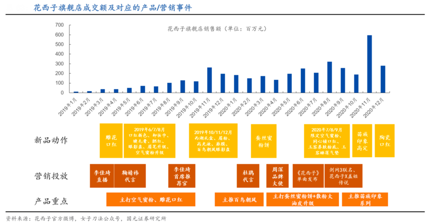 經(jīng)典案例:從花西子官方微博、女子刀法公眾號(hào)、國元證券研究所等綜合資訊表明,2019年為花西子爆發(fā)式成長的關(guān)鍵節(jié)點(diǎn),一方面品牌確立空氣散粉與雕花 口紅兩個(gè)主推產(chǎn)品,另一方面與超頭主播李佳琦形成深度綁定。