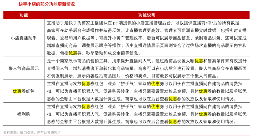 經(jīng)典案例:根據(jù)磁力引擎、東方證券研究所等綜合資訊表明,快手小店 2020 年以來,迎來了密集的功能完善,新增了很多數(shù)據(jù)回傳和管理工具、流量獲取工具、商品管理和上架工具等。