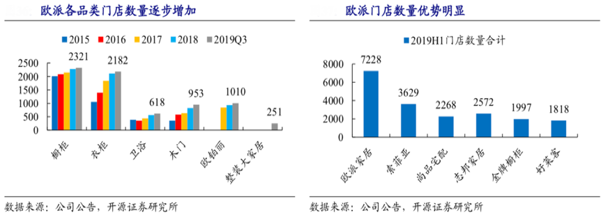經(jīng)典案例:根據(jù)公司公告、開源證券研究所等綜合資訊表明,截至2019Q3,歐派共有門店合計 7335 家(包括整裝大家居251家);分品類看,廚柜門店數(shù)量明顯占優(yōu),衣柜差距縮小。歐派廚柜在經(jīng)銷商和門店 數(shù)量依然擁有較大領(lǐng)先優(yōu)勢,衣柜門店規(guī)模逐漸接近索菲亞。其他品類中,衛(wèi)浴、木門和歐鉑麗開店的頻率仍然較高;整裝大家居已經(jīng)初具規(guī)模。